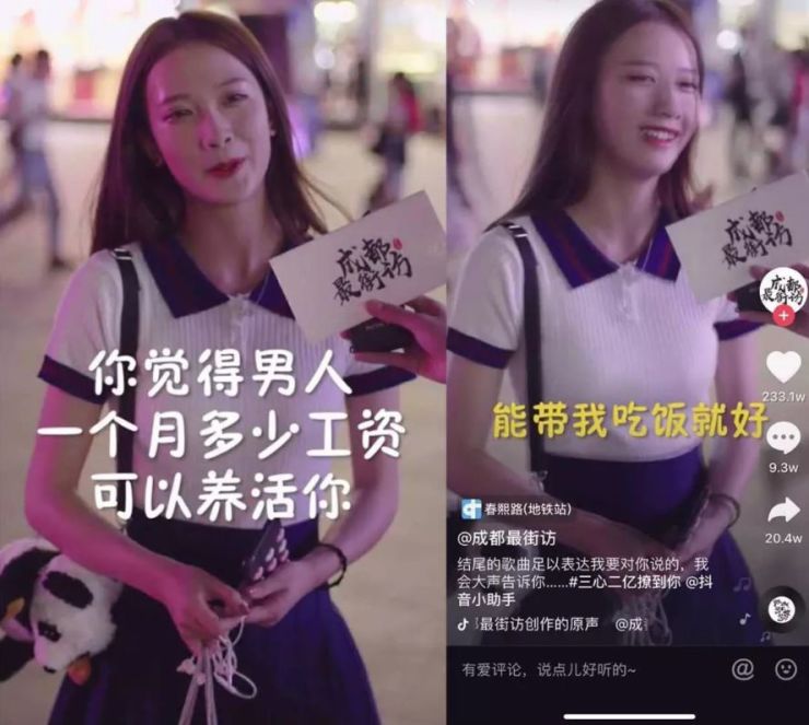 没错,就因为这句话——“能带我吃饭就好”,她成了现象级网红。很多男生竟真的赶往成都,只为请这位姑娘吃饭。